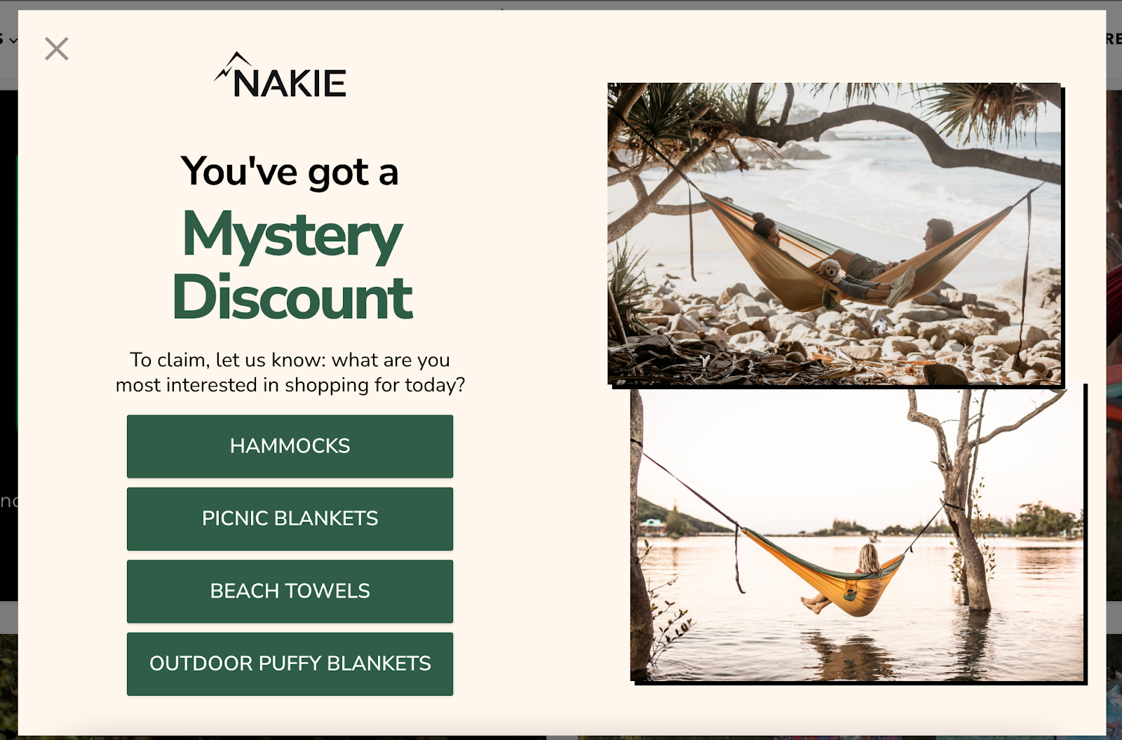 Nakie, the Australian outdoor gear brand behind the world's first hammock made from recycled plastic bottles, transformed their email capture strategy with a multi-screen popup approach.