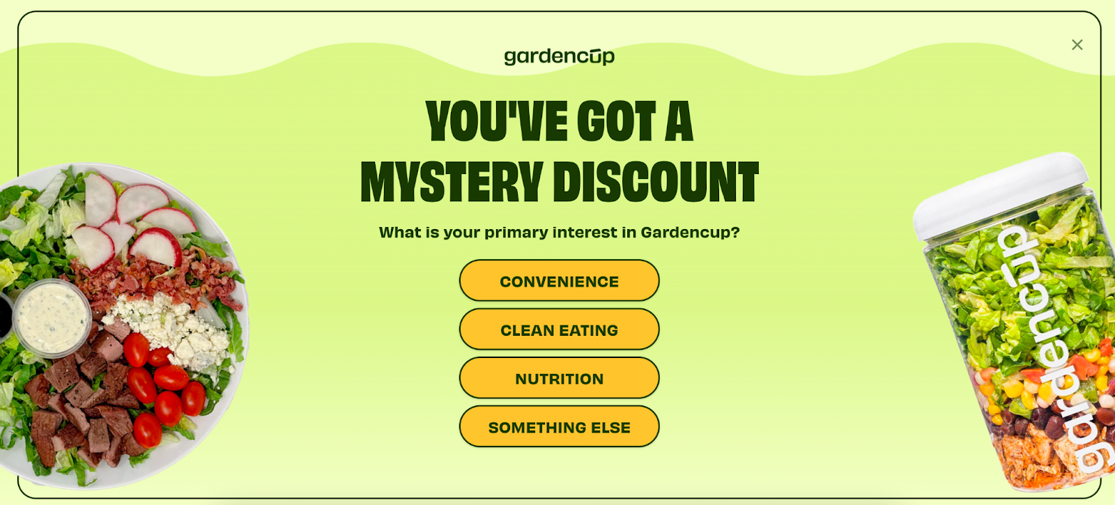 Gardencup, a US-based meal subscription service, replaced generic static popups with an engaging "mystery discount" experience. This gamification approach combined the excitement of unknown rewards with practical zero-party data collection.