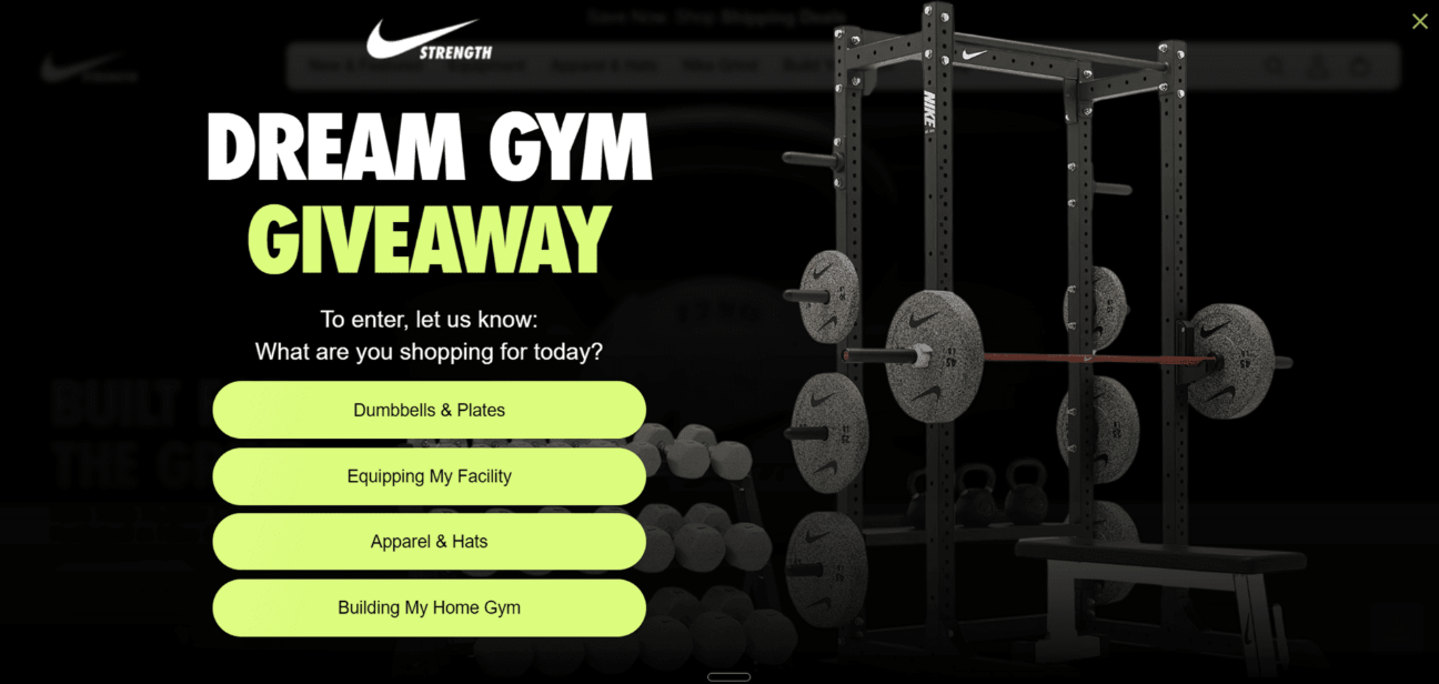 Instead of leading with a discount, Nike Strength hooks visitors with a giveaway, which way more exciting than "10% off your first order."