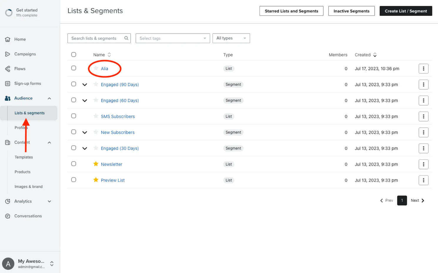 - Navigate to Audience → Lists & Segments.