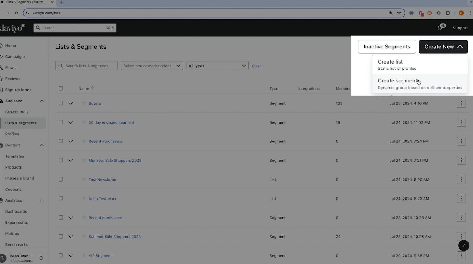 - Go to Lists & Segments in Klaviyo.