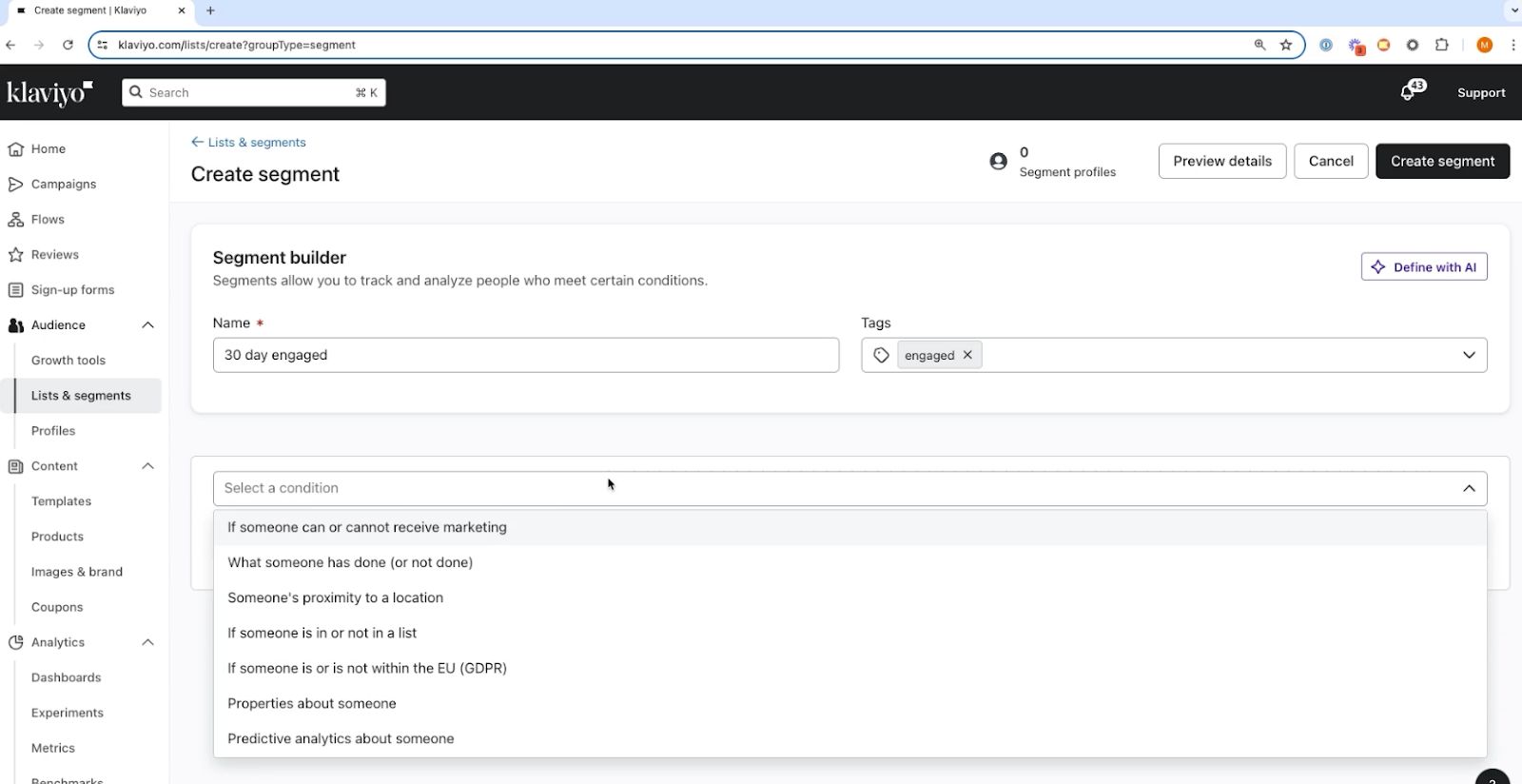 - Click Create List/Segment → Segment.