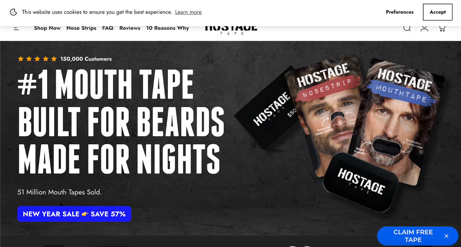 Hostage Tape, the sleep and breathing optimization brand is a standout in DTC health. With 150K–200K monthly visitors, Hostage Tape turned their popup into a brand storytelling moment — using full-screen designs that incorporate the founder's story and educational elements. The result? A 25% email opt-in rate and a 245% increase in welcome flow revenue.