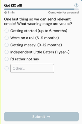 Instead of relying on standard popups, Bibado embedded Alia directly into their landing pages, creating a more immersive experience. This allowed the brand to educate customers about the developmental advantages of their products while offering them discounts for completing the process.